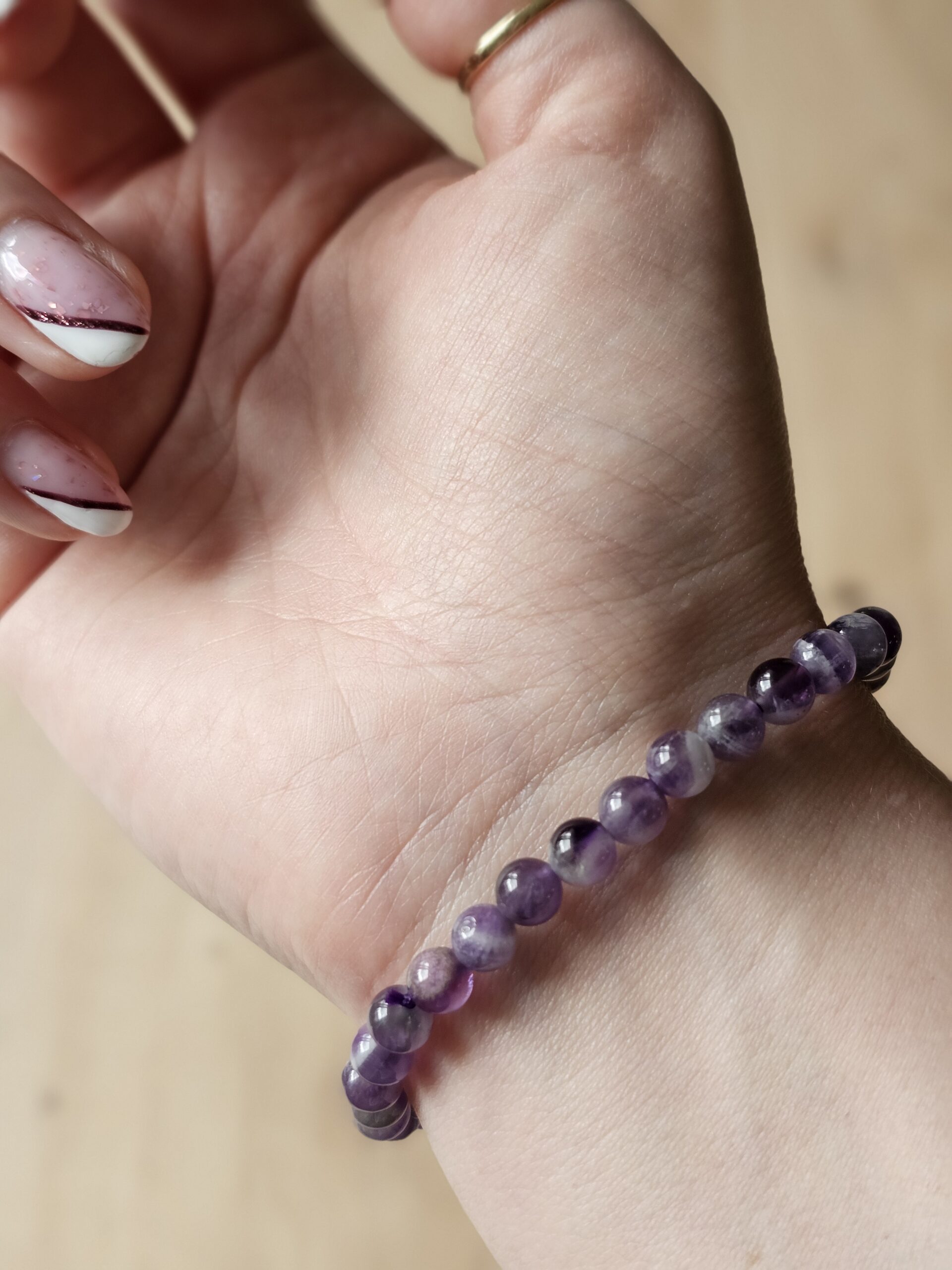 Das Armband besteht aus kleinen, polierten Amethystperlen in verschiedenen Violettnuancen – von hellen, milchigen Tönen bis hin zu tiefen, satten Farben. Sein minimalistischer und universeller Charakter macht es zu einem idealen Begleiter für alltägliche wie auch elegante Outfits.