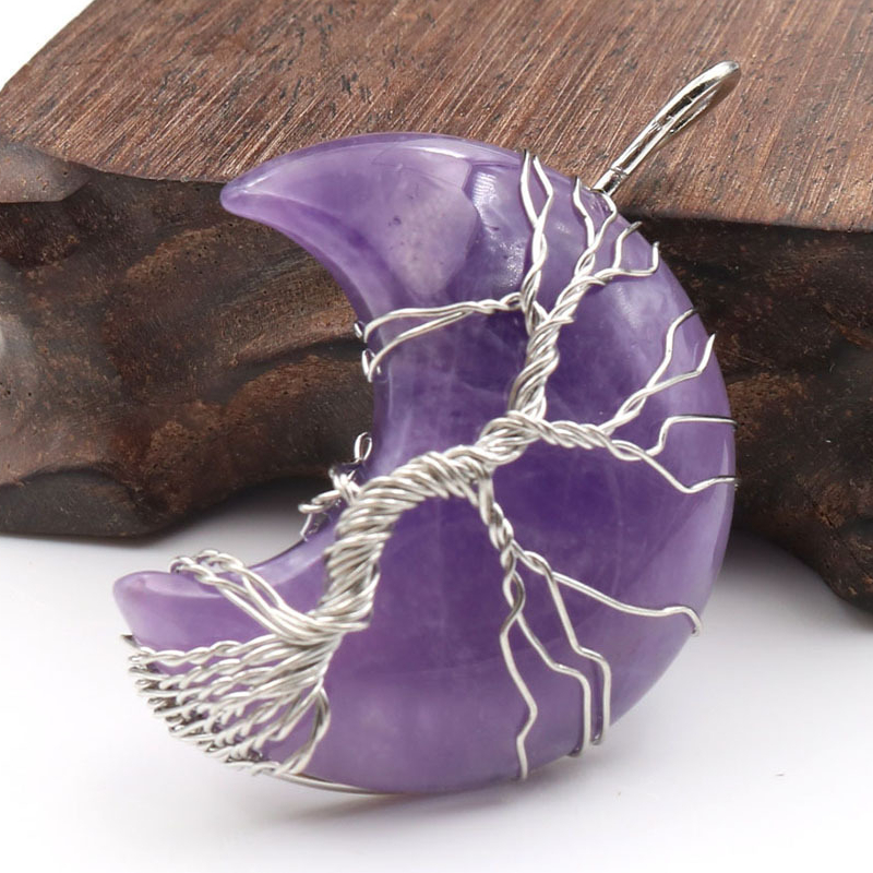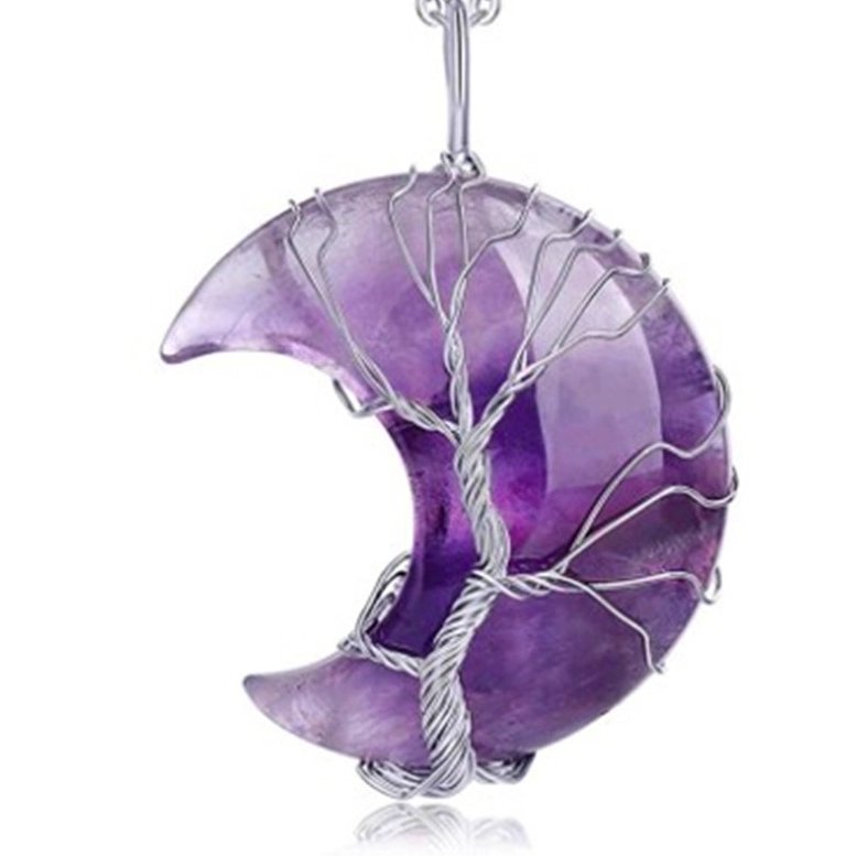 Amethyst Halbmond Anhänger – stilisiert – Ruhe und Intuition. Anhänger mit einer Strass-Bryłka in Halbmondform.