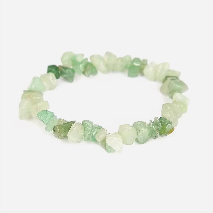 Das Armband besteht aus natürlichen, rohen Stücken grünen Aventurins, deren Farbnuancen von hellem Grün bis zu tiefen, waldigen Tönen reichen. Jeder Stein besitzt eine individuelle Form und einen eigenen Glanz, was dem Schmuck ein authentisches, organisches Erscheinungsbild verleiht. Die rohe Struktur betont seine natürliche Schönheit und den subtilen Charme.