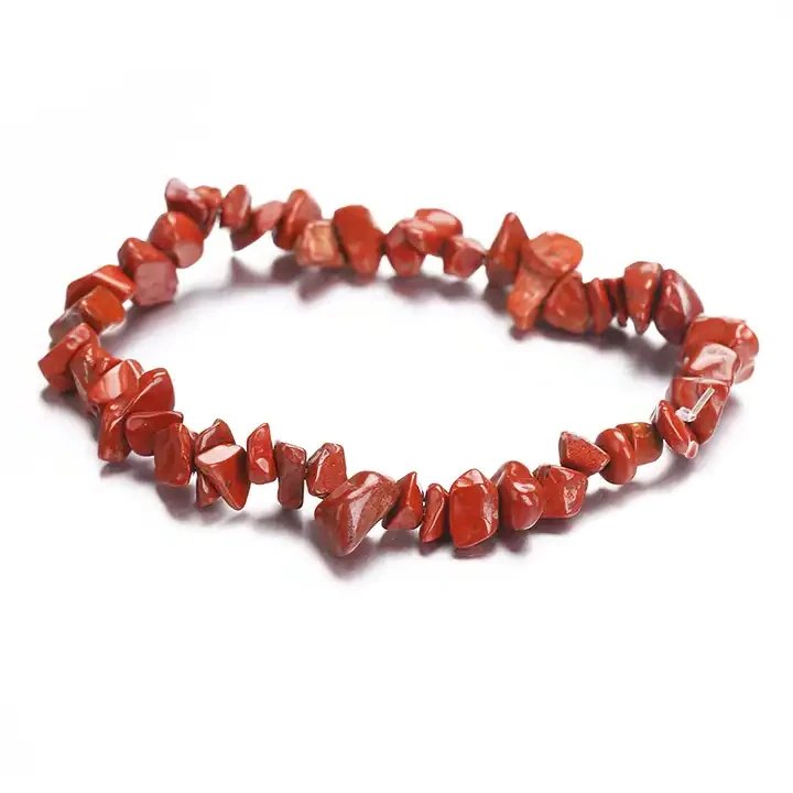 Das Armband besteht aus natürlichen roten Jaspis-Steinen, deren Farbpalette von ziegelroten Nuancen bis hin zu Braun und Ocker reicht. Jeder Stein besitzt eine einzigartige Form und Farbgebung, was dem Schmuckstück einen authentischen, rohen Ausdruck verleiht. Die natürliche Form unterstreicht seine Schlichtheit und zeitlose Wirkung.