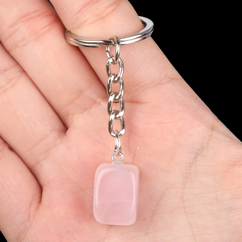 Eine Verbindung aus Sanftheit und Harmonie – ein Rosenquarz-Schlüsselanhänger als kleiner Talisman der Wärme, der an die Kraft von Ruhe und Empathie erinnert.